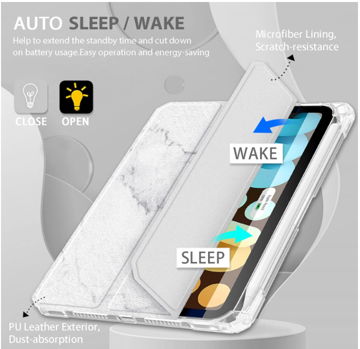Capacul magnetic oferă funcția de reactivare/reactivare automată, prelungește timpul de așteptare și reduce pierderea bateriei. Touch ID disponibil, rapid și ușor de deblocat tableta.
