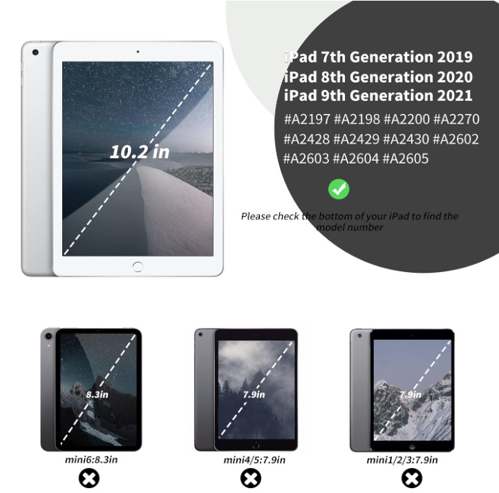 Carcasă iPad 10,2 (26 cm) inch: Această husă este numai pentru iPad 9. Generația 2021 / iPad a 8-a generație 2020 / iPad a 7-a generație 2019, potrivită pentru modelele iPad: A2602 / A2603 / A2604 / A2605 / A2197 / A22708 / A22708 /A2428/A2429 /A2430. Nu este compatibil cu alte dispozitive, verificați partea de jos a iPad-ului pentru a găsi numărul modelului.