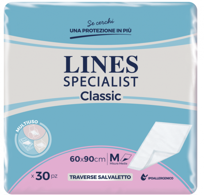 Alezele Lines Specialist Classic în mărimea M, cu dimensiunile de 60x90 cm în set de 30 de bucăți, reprezintă alegerea ideală pentru a asigura un mediu confortabil și igienic pentru patul dumneavoastră sau pentru persoanele în îngrijire. Cu un strat absorbant de înaltă calitate, aceste aleze sunt concepute pentru a absorbi în mod eficient orice scurgere de lichide, menținând astfel suprafața patului uscată și curată.