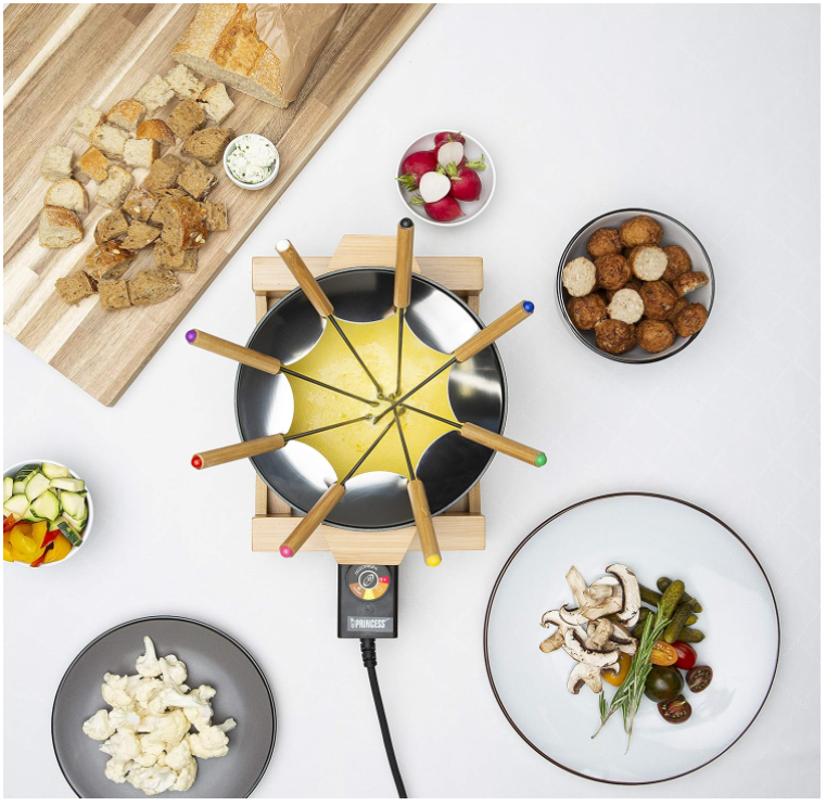 Fondue Pure include 8 furculițe pentru fondue cu design elvețian cu trei dinți, care păstrează ingredientele mai bine pe furculiță.