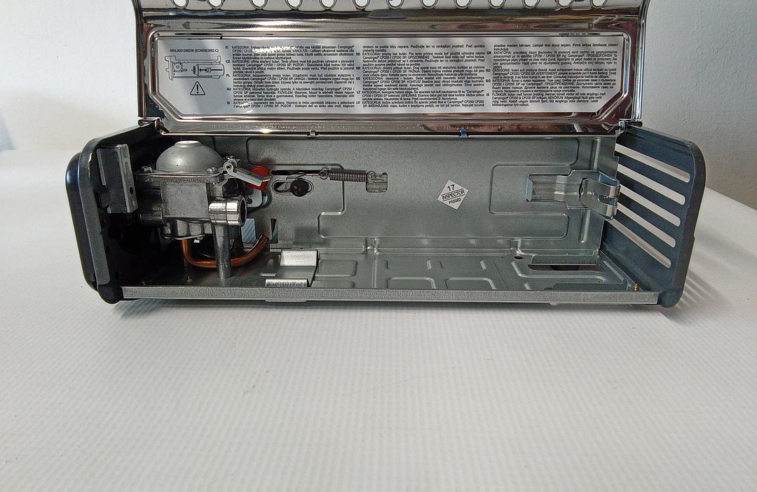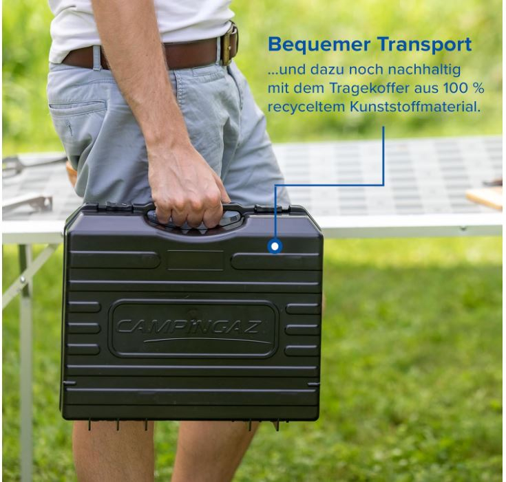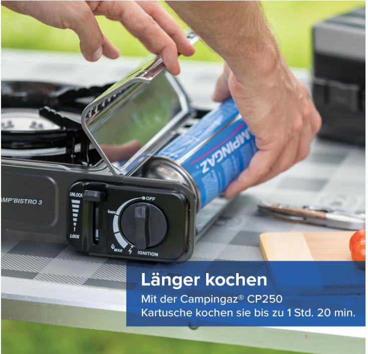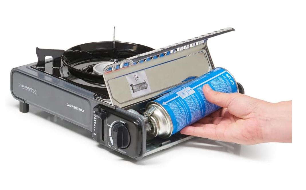 Design practic: functioneaza cu butelie de gaz Campingaz CP 250 (nu e inclusa), care se baga in compartimentul integrat in timpul functionarii;