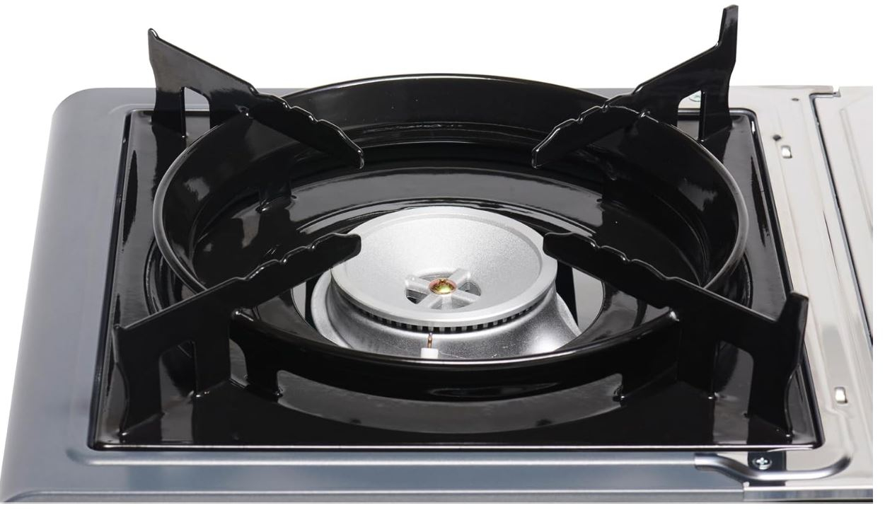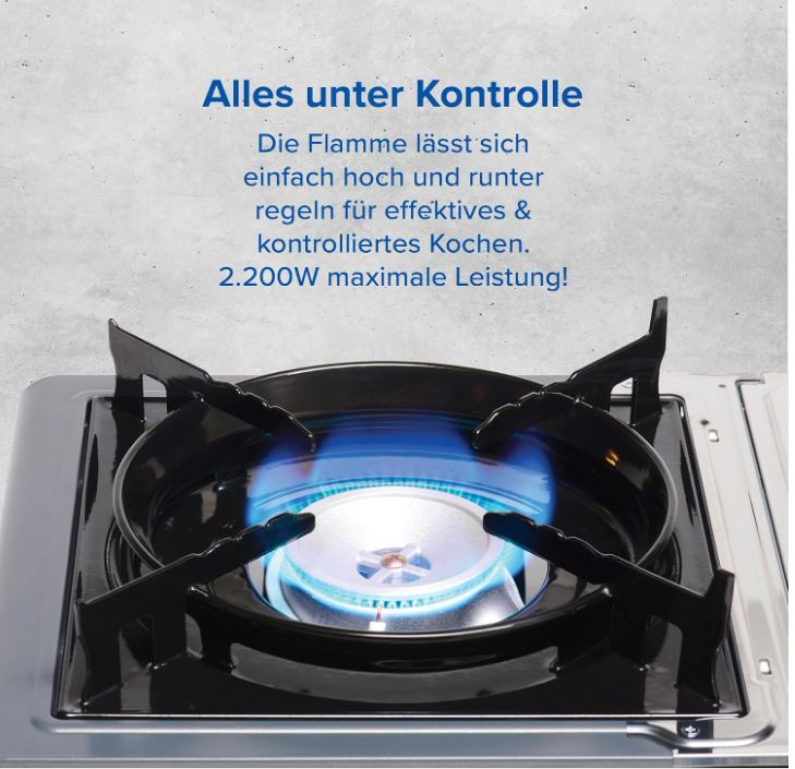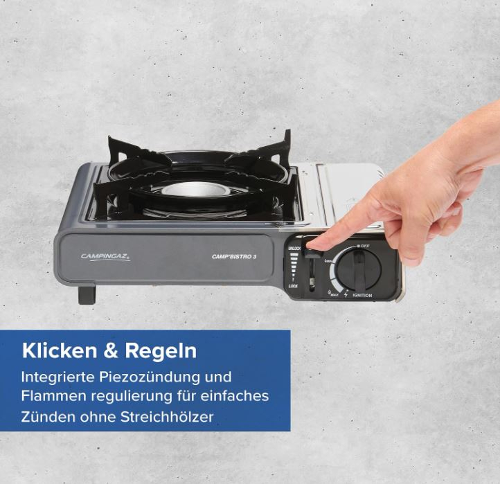 Compact și puternic: aragaz de camping ușor de utilizat cu aprindere piezo, flacără reglabilă, cu suport robust pentru oale pentru tigăi și oale cu diametrul de până la 26 cm