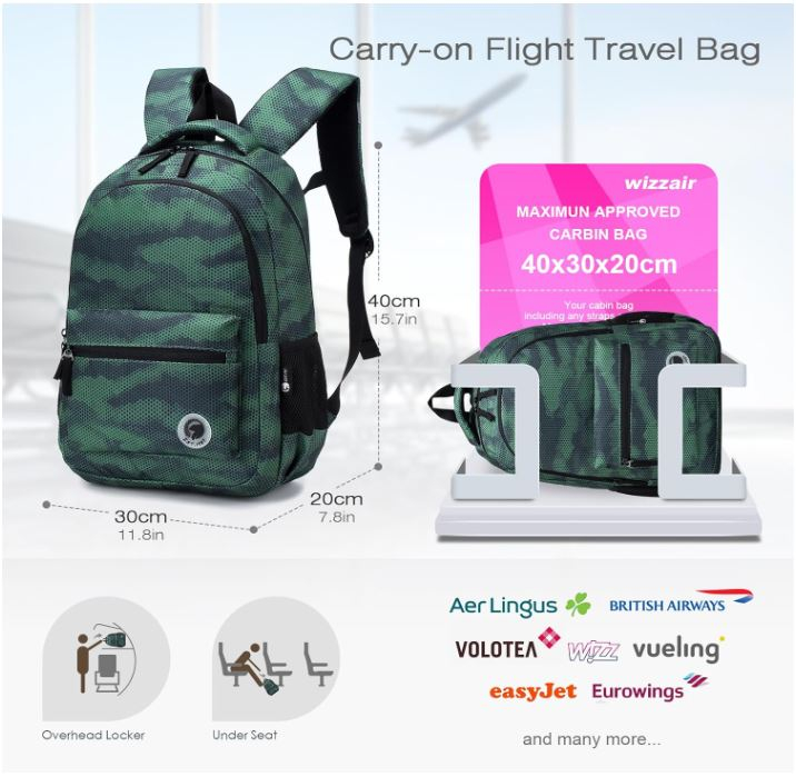 Geantă de voiaj pentru cabina British Airways 40 x 30 x 15 cm. Dimensiunea rucsacului de călătorie pentru bagaj de mână corespunde exact dimensiunii maxime pe care o puteți lua gratuit în cabină atunci când zburați cu geanta de cabină British Airways 40 x 30 x 15 cm/20 L, care este perfectă și ca un rucsac mic de cabină sub scaun. Este acceptat de aproape toate companiile aeriene majore din întreaga lume; inclusiv easyJet, British Airways, Etihad, Emirates, Delta, Norwegian, Jetblue, KLM, Quatar, Wizz Air și multe altele.