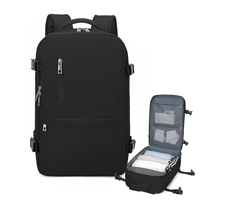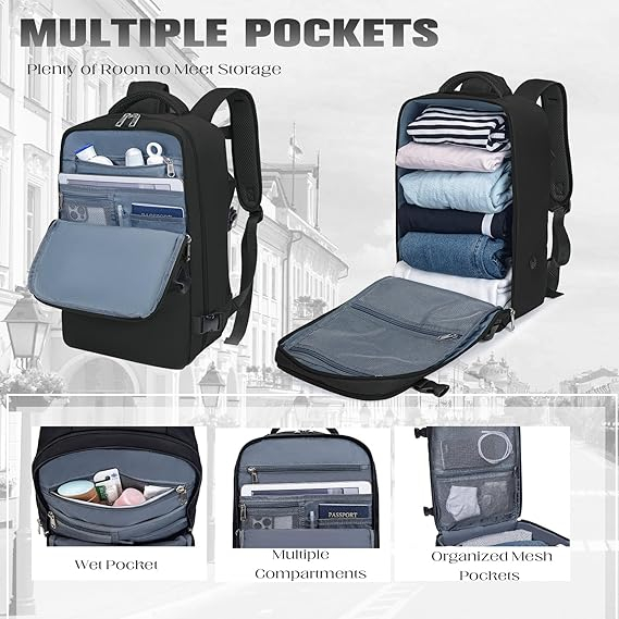 Bagaj de mână pentru Ryanair: 40 x 20 x 25 cm, 20 litri, pe deplin compatibil cu dimensiunea bagajului de mână Ryanair, există și catarame pe lateralul rucsacului pentru a-l comprima puțin, nu trebuie să vă faceți griji pentru bagajele supradimensionate. Gențile de rucsac sunt potrivite pentru majoritatea companiilor aeriene, pot fi deschise la 180° ca o valiză, se potrivesc în compartimentele de bagaje și sub scaune.