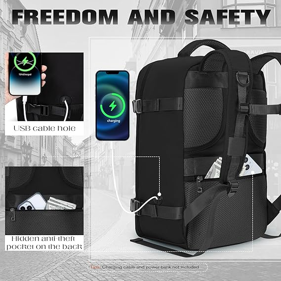 Diverse compartimente: buzunar ascuns din spate pentru telefon mobil, portofel și obiecte de valoare. Rucsacul are câteva buzunare mici încorporate pentru iPad, laptop, pixuri și pașaport. Facilitează urcarea rapidă în avion pentru călători.
