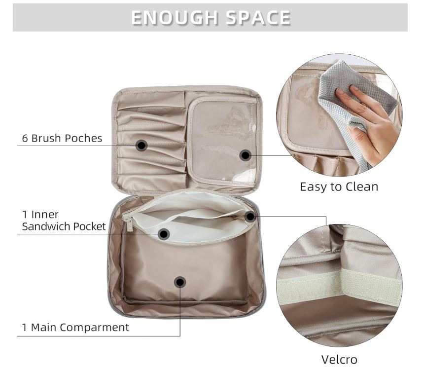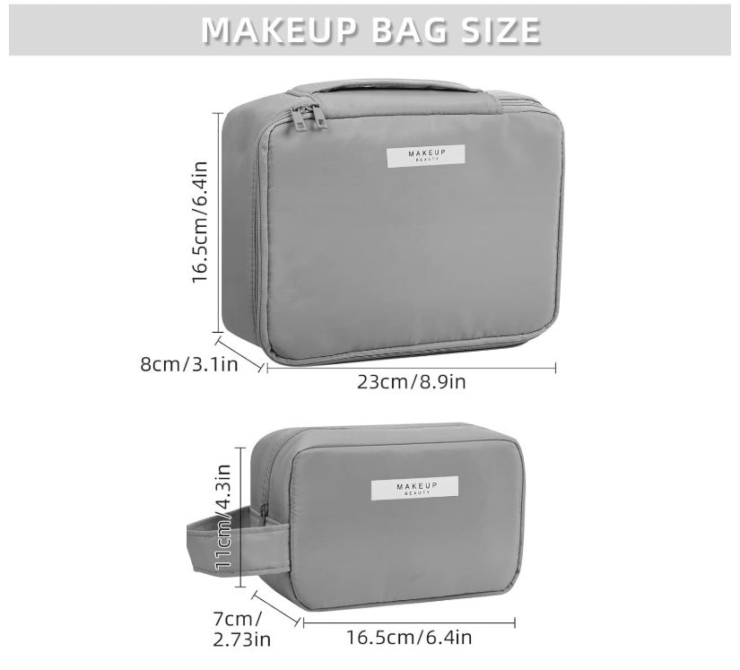 2 genti de machiaj au suficient spatiu, geanta mare de machiaj poate depozita produsele cosmetice zilnice de care ai nevoie: fond de ten, rimel, fard de pleoape, pensula de machiaj, crema de fata, etc. O alta geanta mica de machiaj poate depozita ruj, oglinda de machiaj, chei, monede, etc pentru utilizarea zilnica la serviciu.