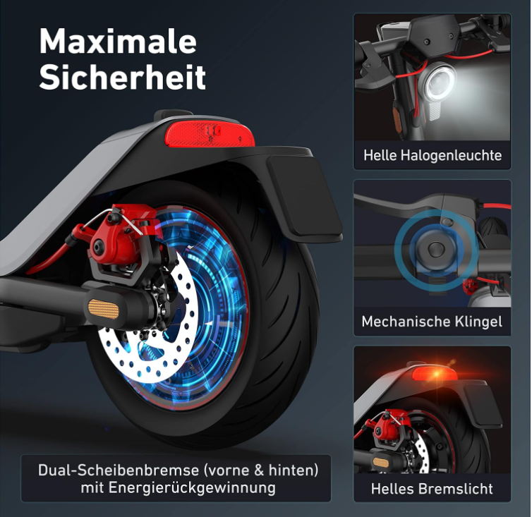 Frână cu disc dublu cu recuperare de energie, lumină față, lumină de frână și reflectoare laterale pentru siguranță sporită în traficul rutier