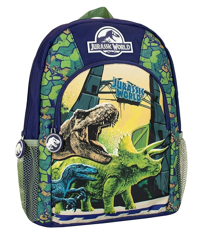 Rucsac Jurassic World pentru copii. Acest rucsac epic este perfect pentru orice iubitor de dinozauri! Rucsacul prezintă un imprimeu cu Velociraptorii, T-Rex și Triceratops, cu intrarea în Jurassic World în fundal! Acest rucsac cu tematică dinozauri este ideal pentru aventuri! Cu un compartiment principal, un buzunar frontal și buzunare din plasă pe laterale, bretele reglabile și o etichetă cu fermoar Jurassic World, acest rucsac fantastic este pur și simplu o necesitate!
