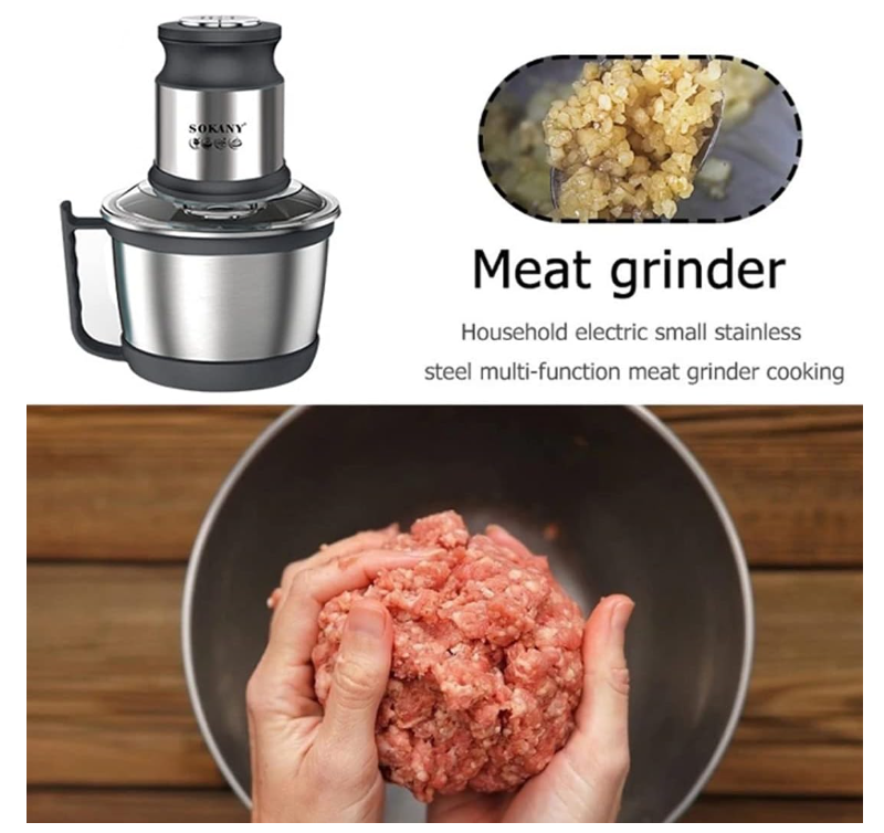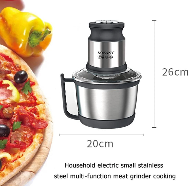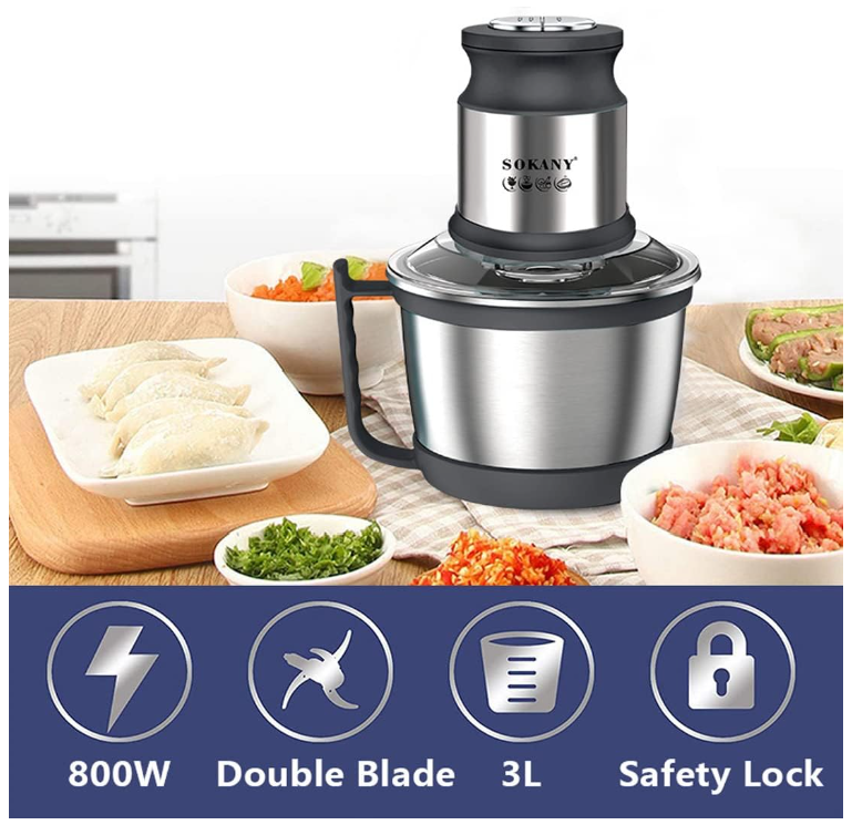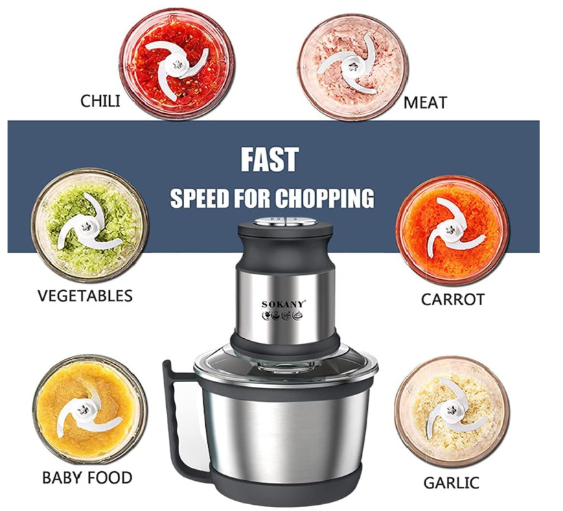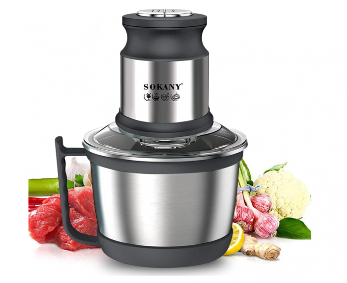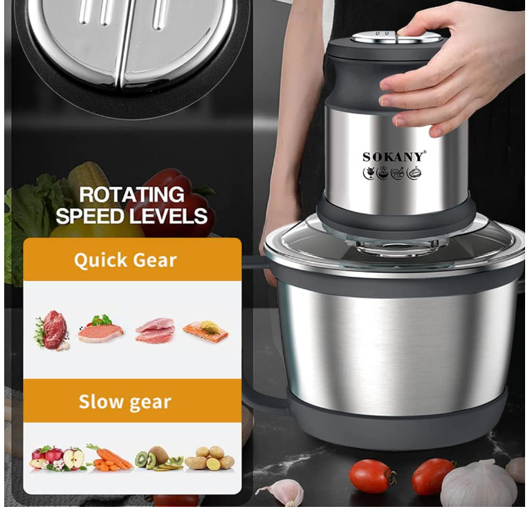 Tocatorul electric Sokany este echipat cu 4 lame din otel inoxidabil si 2 setari de viteza din care sa alegi. Puteți toca și măcina cu ușurință diverse ingrediente precum ceapa, carnea, șunca, usturoiul, ceapa, ierburi mici.