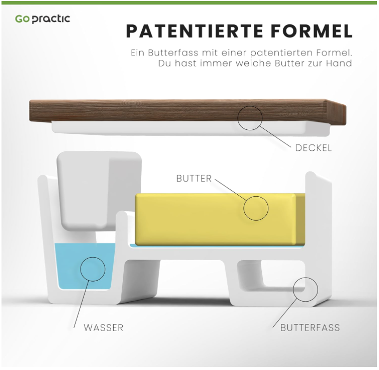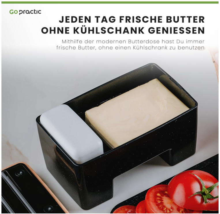 Bucurați-vă de unt proaspăt în fiecare zi, timp de până la 14 zile fără frigider, cu vasul de unt al nostru! Designul patentat asigură că untul rămâne întotdeauna moale.
