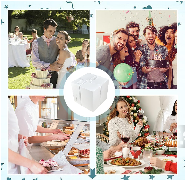 Această cutie de tort este perfectă pentru a ține tot felul de prăjituri, cutia de cadou albă se poate potrivi perfect pentru toate tipurile de ocazii de petrecere din lume, vă puteți lăsa și binecuvântarea pe cutie; Folosit în principal pentru ziua de naștere, nuntă, Ziua Îndrăgostiților, aniversare sau cină zilnică, întruniri de familie ca tort cadou.