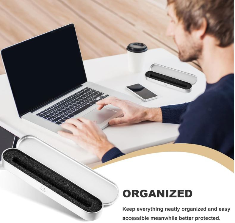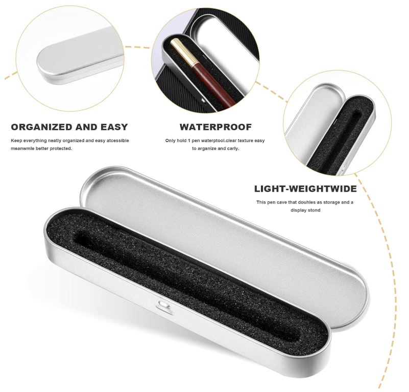 Cutia este realizată din material SPTE de înaltă calitate, carcasă de tablă cu balamale, acoperire la 360 de grade fără unghi mort, fiabilă și puternică în utilizare, nu este ușor de deformat și reutilizabil. Fanta încorporată pentru stilou din material burete menține stiloul în poziție și împiedică zgârierea articolelor.