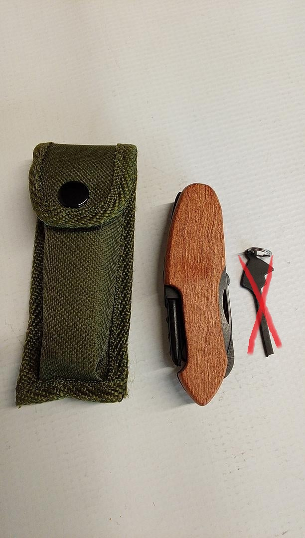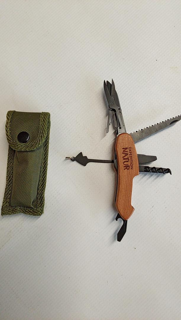 Funcțiile sunt: ​​tirbușon, lamă de cuțit, foarfece, deschizător de sticle, deschizător de conserve, pilă de unghii, șurubelniță Phillips, ferăstrău pentru lemn și alez. În geanta de depozitare la îndemână, unealta este depozitată în siguranță în deplasare