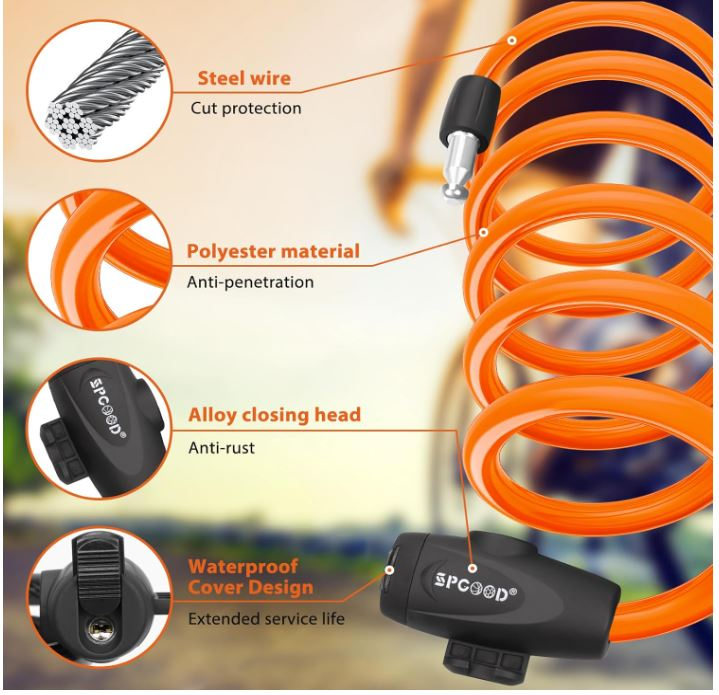 Securitate ridicată Lacătul SPGOOD pentru biciclete folosește un cablu de oțel gros de 12 mm, care are rezistență puternică la forfecare și la coroziune. Cilindrul de blocare din aliaj de zinc ranforsat și capacul carcasei ABS durabil îngreunează deschiderea atacatorilor