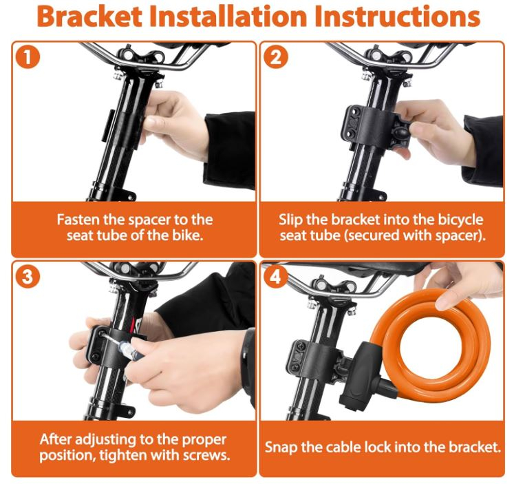 Ușor de transportat: Lacătul nostru pentru bicicletă din material cablu vine cu dispozitivul de montare și forma spirală a broaștei pentru o conectare ușoară la cadrul bicicletei. Clipul în spirală poate fi rulat de la sine, ceea ce este ușor și convenabil