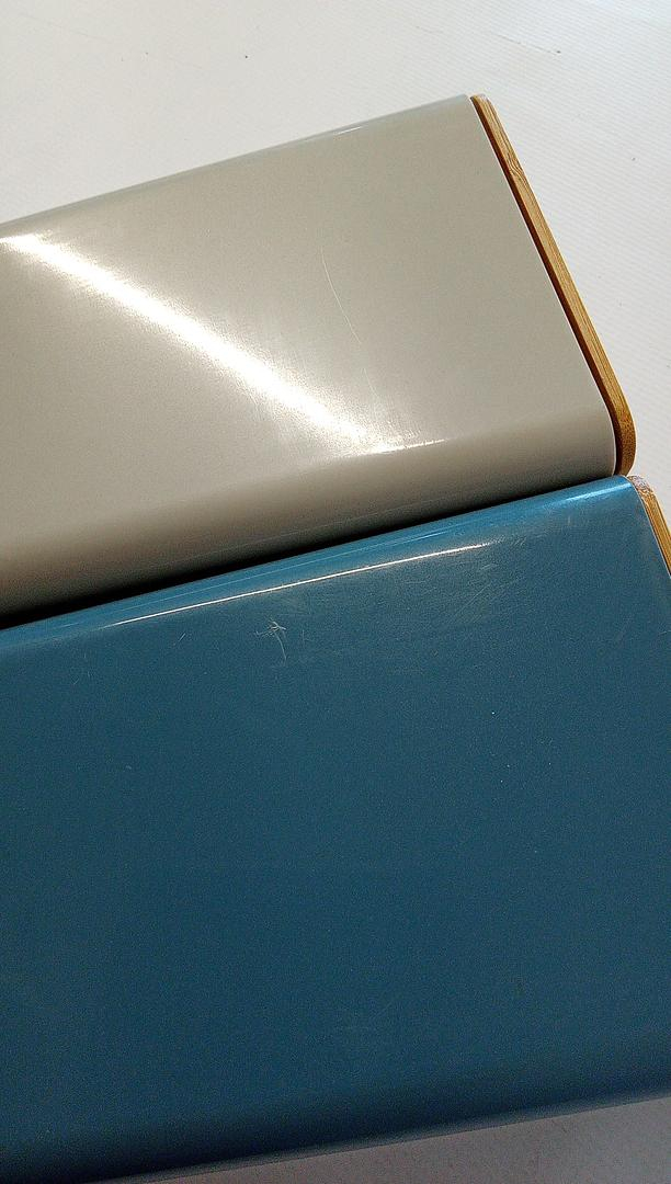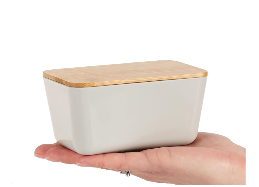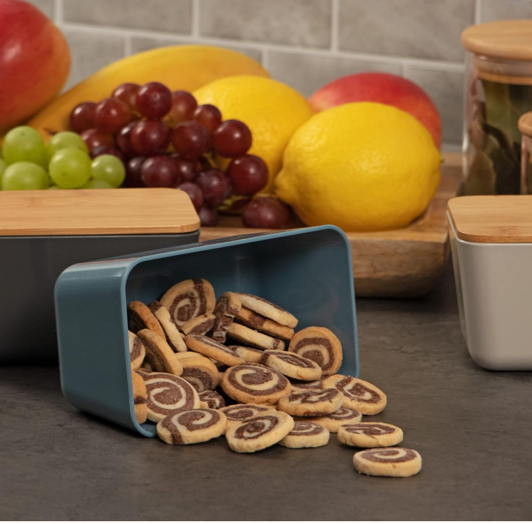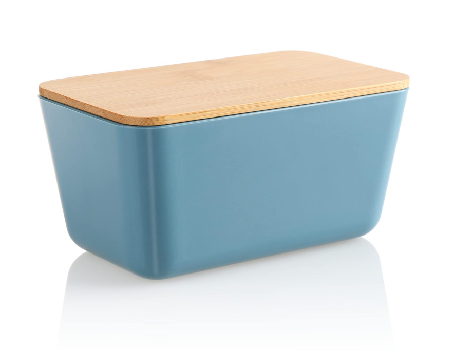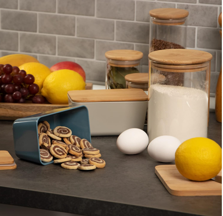 Conținutul cutiei: 2 x borcane de depozitare cu capac. Dimensiuni: aprox. 13 x 8 x 7 cm (latime x adancime x inaltime). Material: plastic, bambus. Culoare: gri deschis, albastru.