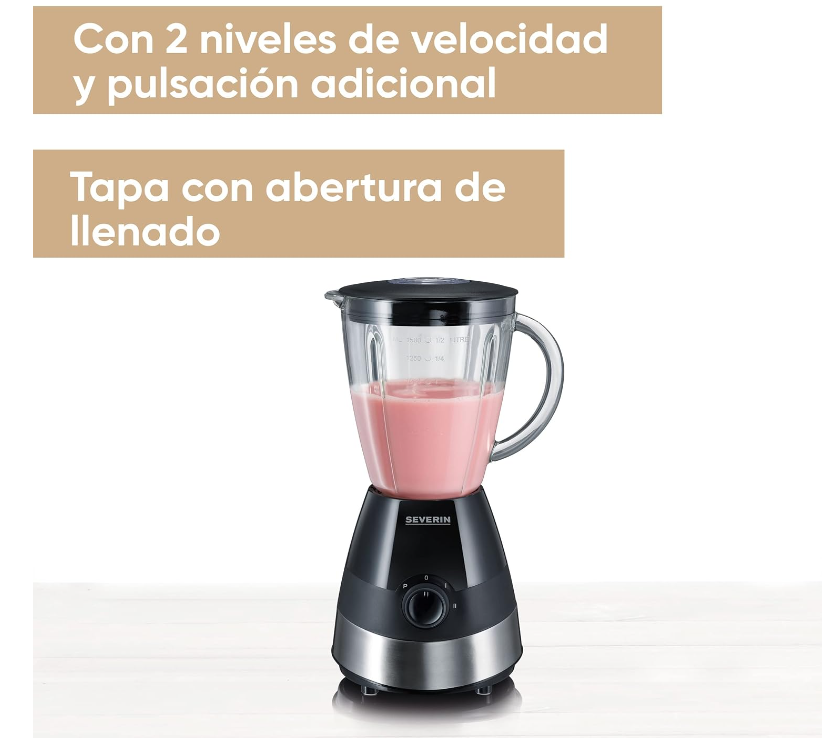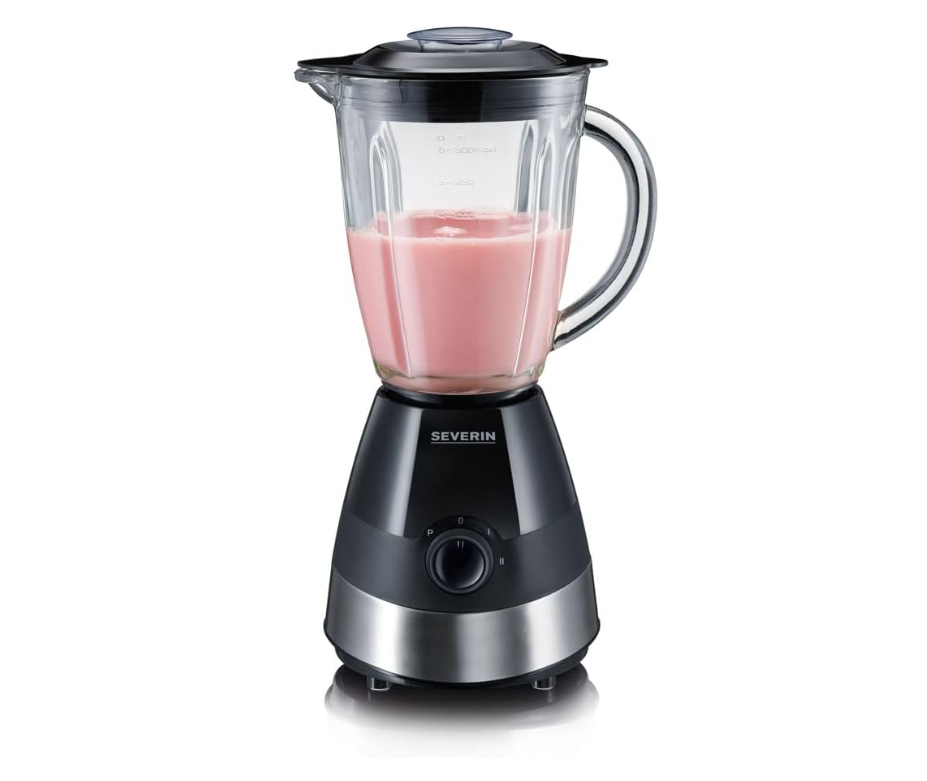 Amestecare rapidă: blender practic cu bază de plastic și recipient de sticlă detașabil.