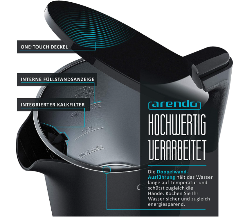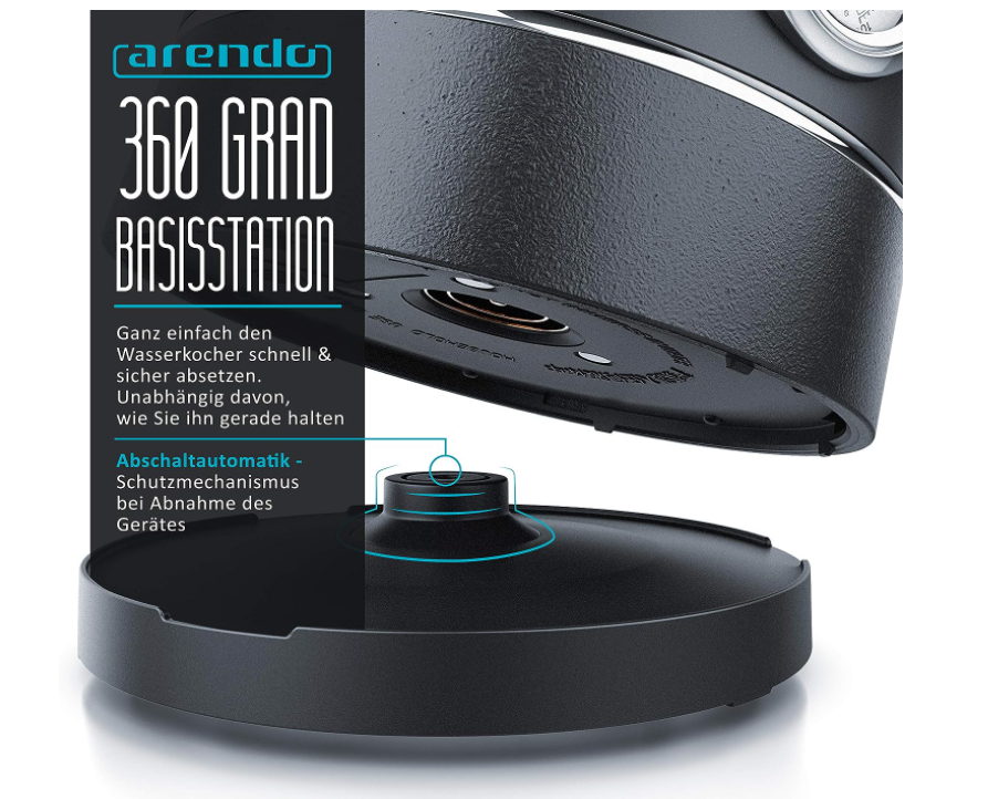 Totul dintr-o privire: volum: 1,5 litri, 1800 wați, perete dublu, afișaj analog al temperaturii, filtru de calcar, măsurători precise cu senzor de temperatură, indicator de nivel intern, oprire automată și manuală, element de încălzire ascuns, stație de bază 360° cu depozitare cablu, protectie la fierbere uscata si supraincalzire, intrerupator cu lampa incandescente, siguranta testata GS