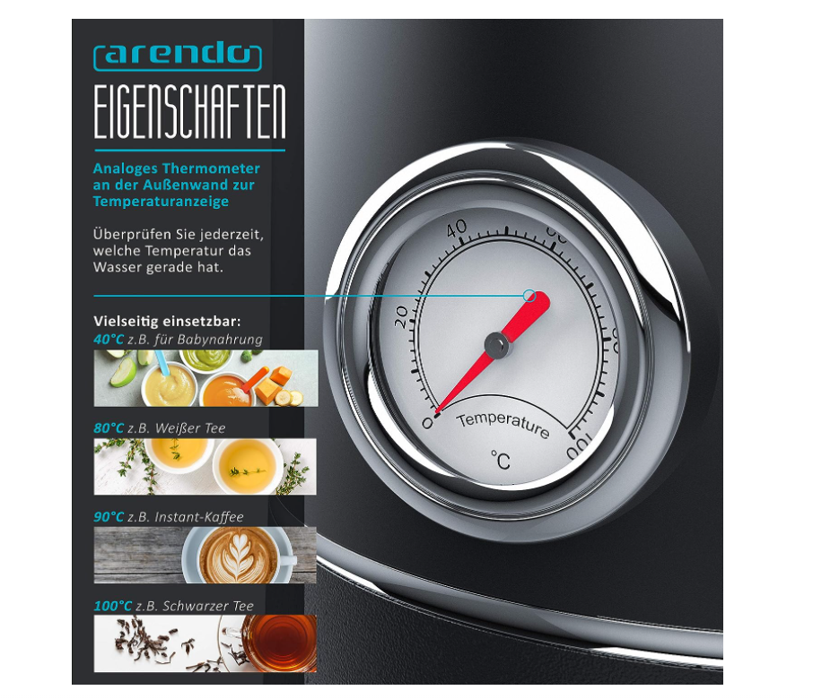 Fierbătorul fascinează cu afișajul său analog rotund (de la 0 la 100°) pe lateral. Aceasta nu este doar vizual o sărbătoare pentru ochi, dar oferă și avantajul tangibil că obțineți temperatura afișată chiar și atunci când dispozitivul este pornit pe masă. Așa că puteți vedea în orice moment dacă apa este încă suficient de fierbinte pentru a fierbe/reumple pentru ceai. | 304906