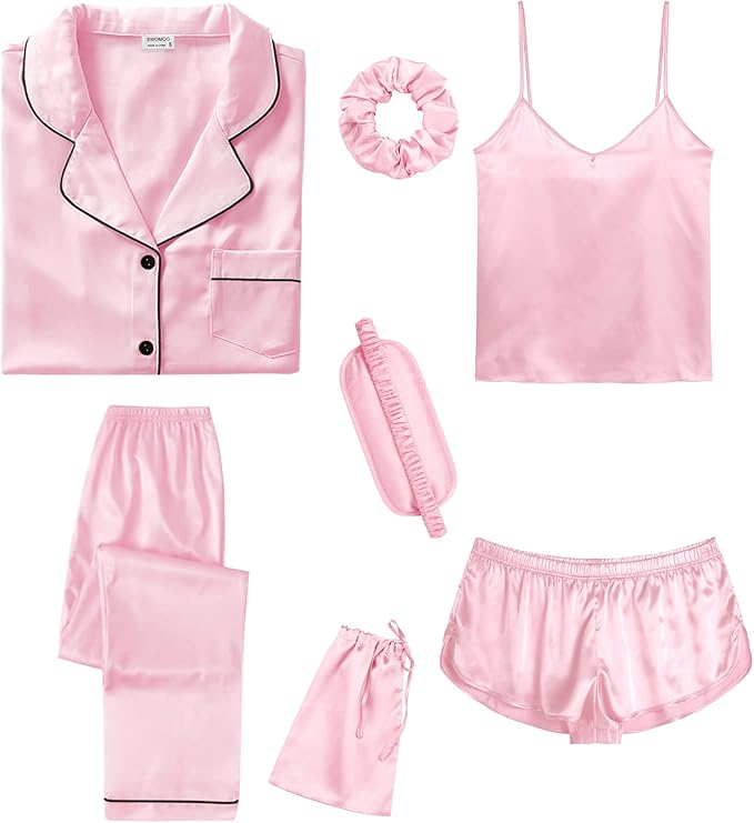 Set de pijamale din satin de mătase pentru femei, 7 piese, inclusiv: 1 top, 1 pantaloni scurți drăguți, 1 cămașă cu mânecă scurtă, 1 pantaloni lungi, 1 bandă pentru păr, 1 mască pentru ochi, 1 geantă de depozitare pentru pijamale.