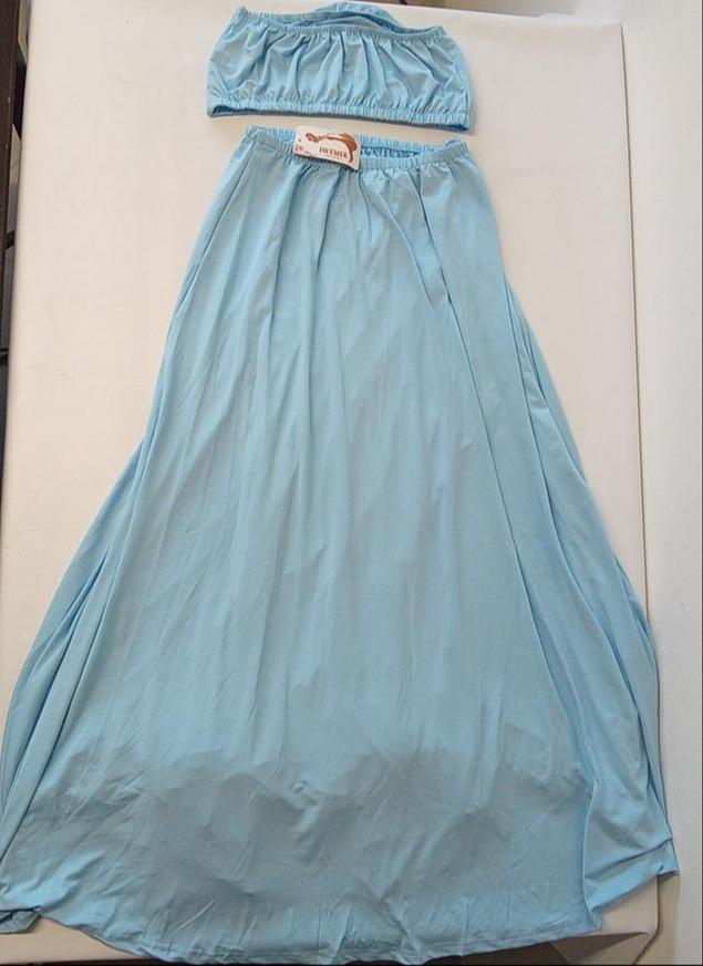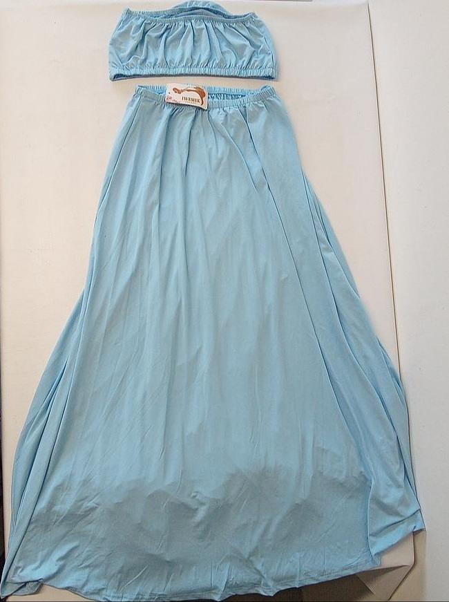 Adaugă un strop de eleganță relaxată garderobei tale de vară cu acest set feminin de la IWEMEK. Setul include un top tip bandeau elastic și o fustă lungă, amplă, cu talie elastică pentru confort sporit. Confecționat dintr-un material ușor și plăcut la atingere, este ideal pentru zilele călduroase, vacanțe, festivaluri sau plimbări pe plajă. Culoarea albastru deschis adaugă un aer proaspăt și delicat, iar croiul lejer avantajează silueta. Mărimea S.