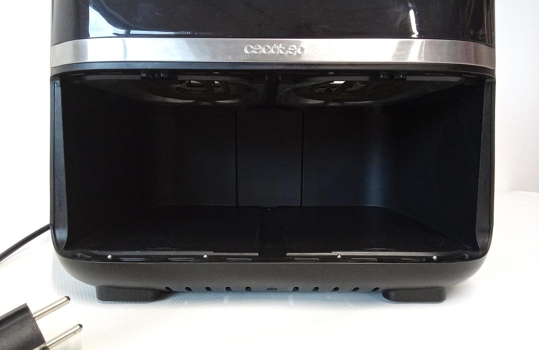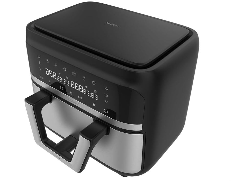 6 moduri preconfigurate care setează timpul și temperatura necesare pentru a găti diferite tipuri de alimente. Dispune de un termostat pentru reglarea temperaturii de la 80°C la 200°C. Timp reglabil de la 0 la 60 de minute. Temperatură dublă în fiecare coș