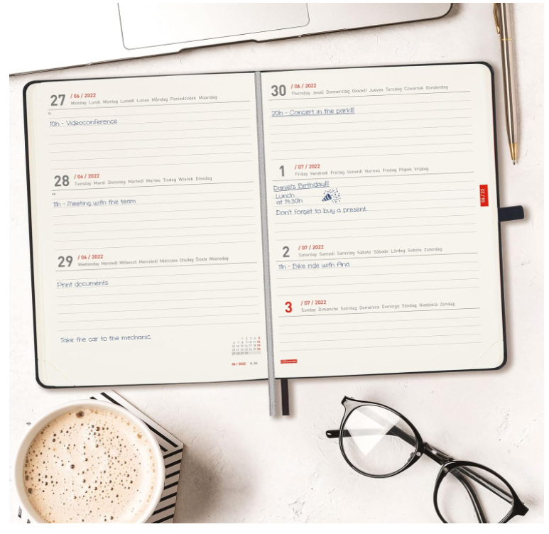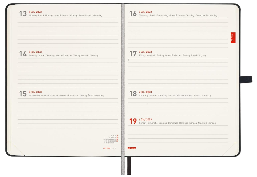 Interior: Săptămâna cu vedere orizontală. Vizualizare săptămânală completă orizontală, permițând o scriere naturală. Agenda multilingvă: engleză, franceză, germană, italiană, spaniolă, suedeză, poloneză și olandeză. Cu informații în anuitatea sărbătorilor din următoarele țări: Argentina, Australia, Belgia, Brazilia, Elveția, Chile, Germania, Spania, Franța, Regatul Unit, Irlanda, Italia, Luxemburg, Monaco, Mexic, Olanda, Polonia, Portugalia, România, Rusia, Suedia, Ucraina și Statele Unite.