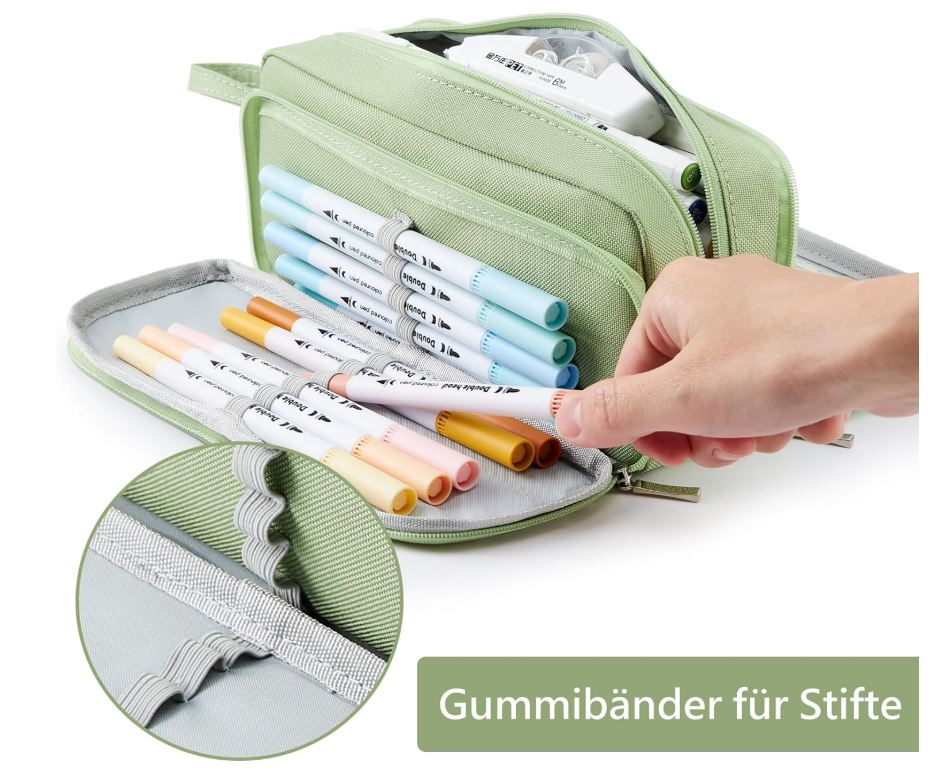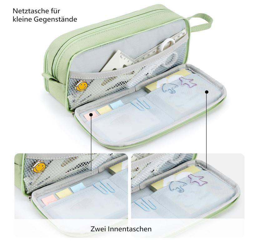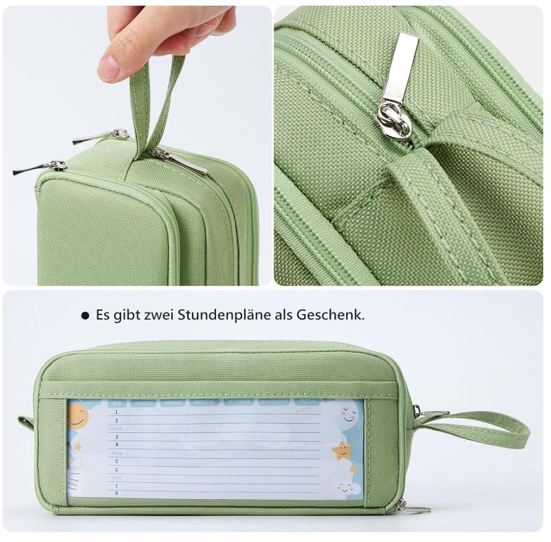 CAPACITATE MARE Acest penar este format din 3 compartimente. În primul compartiment există 8 benzi elastice pentru stilourile tale folosite frecvent. Compartimentul principal oferă spațiu pentru 30-40 de pixuri și alte rigle și echere. Există un buzunar cu fermoar în spate în care pot fi depozitate carduri de transport, căști și alte obiecte mici. Am adăugat un compartiment transparent pe spate pentru a vă putea păstra orarul. (Rechizitele nu sunt incluse)