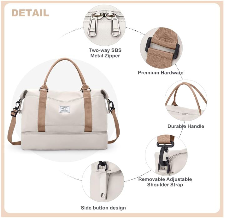 Geantă de transport uscată și umedă separată: Geantă umedă impermeabilă încorporată. Materialul hidrofug de densitate mare vă poate ajuta să separați articolele uscate și umede. Dacă aveți haine ude sau un prosop, îl puteți depozita în această geantă de umăr.