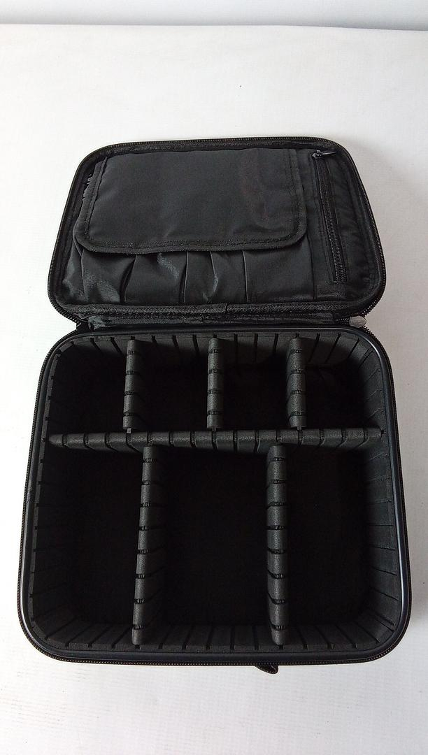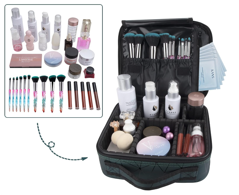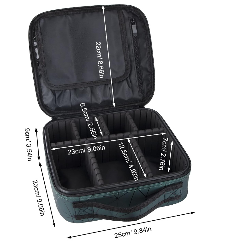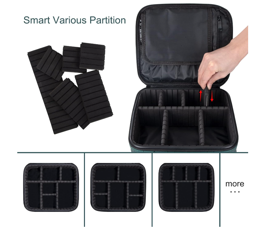 O mulțime de spațiu de depozitare: Exteriorul elegant se deschide pentru a dezvălui o lume de posibilități de depozitare: un buzunar mic cu fermoar, patru pungi elastice pentru perii și sticle, șase partiții detașabile pentru a vă depozita lucrurile și a le face îngrijite și organizate.