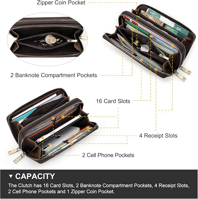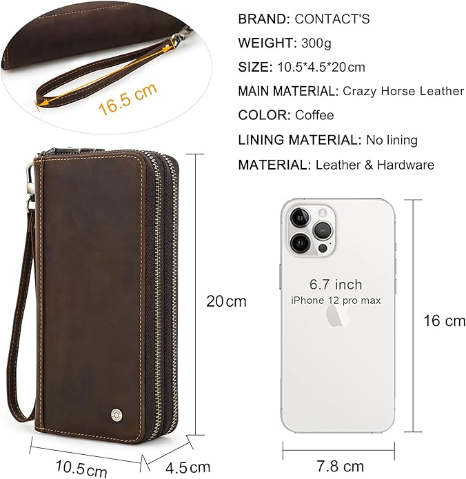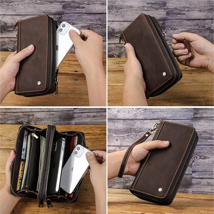Dimensiunea structurii: 10.5*4.5*20cm; 2 fermoare de jur împrejur, cu 4 compartimente, 16 sloturi pentru carduri, 1 buzunar pentru monede cu fermoar, 2 buzunare pentru bilete, poate ține 2 telefoane mobile iPhone 12 Pro Max sau 6,7 inchi.