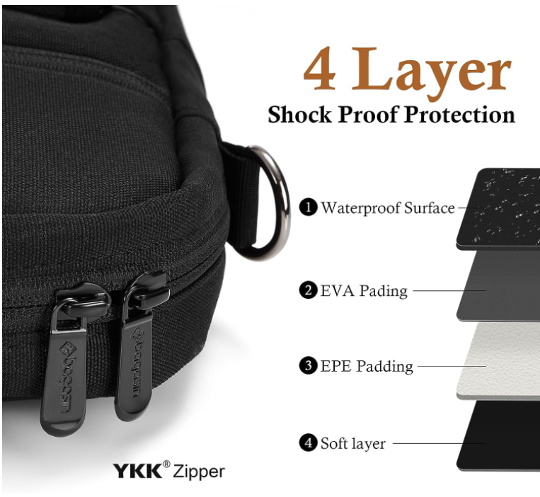 Geanta pentru laptop Bagasin este prevăzută cu protecții în 4 straturi pentru laptopul dvs.: 1. Țesătura cea mai exterioară impermeabilă și rezistentă la zgârieturi; 2. Căptușeală EVA elastică pentru o formă subțire și netedă; 3. Spumă EPE pentru absorbția șocurilor; 4. Strat foarte moale