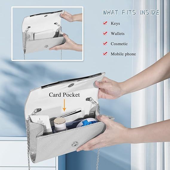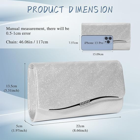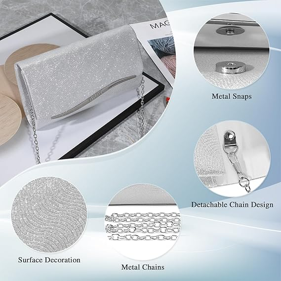 Această geantă clutch argintie cu sclipici strălucitoare adaugă glamour rochiei tale de seară și completează aspectul tău de seară. Gențile noastre de seară vin cu un lanț metalic detașabil, astfel încât să poți transporta geanta în trei moduri: geantă de seară/portofel clutch/geantă de umăr crossbody, care îți oferă mai multe opțiuni și se potrivește perfect cu diferite ținute.