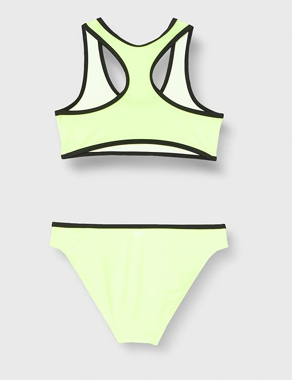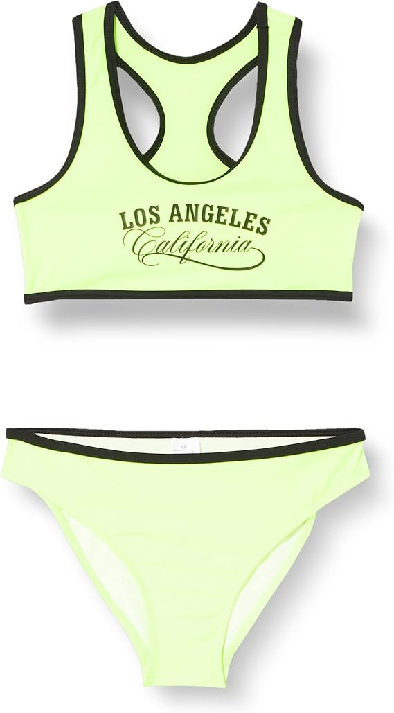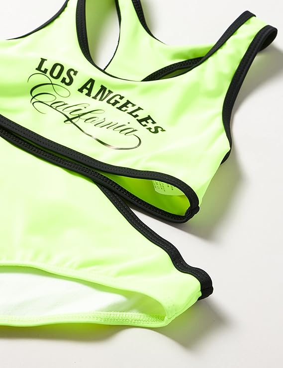 Costum de baie din doua piese pentru fete R9057 galben fluo de la marimea 12-15 ani din colectia High Press 2023. Acest costum de baie din 2 piese pentru fete R9057 galben fluo cu imprimeu iti ofera un look super la moda si confort total pentru toate activitatile. Acest sutien R9057 pentru fete de culoare galben fluo cu insigna LOS Angel negru și chiloți cu cusatura neagră din material reciclată vă vor oferi o satisfacție deplină.