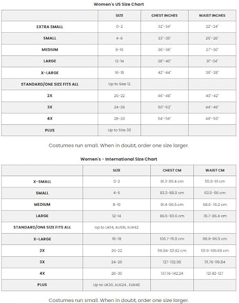 Costumele au dimensiuni diferite de cele ale îmbrăcămintei, utilizați Tabelul cu mărimi pentru femei Rubie, nu alegeți în funcție de mărimea îmbrăcămintei