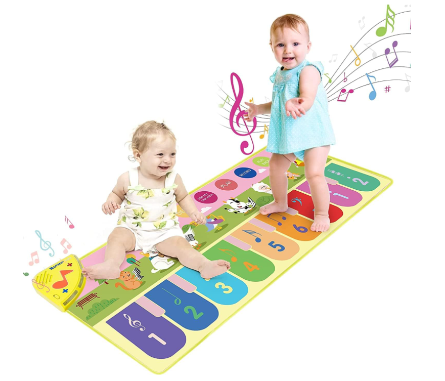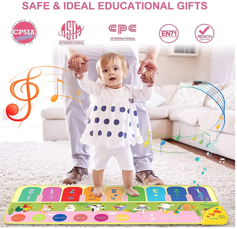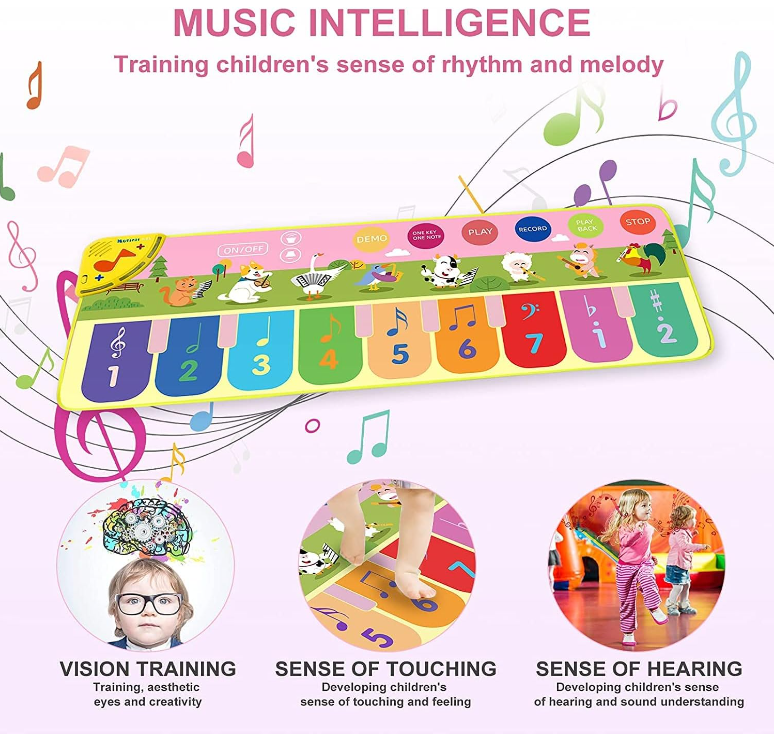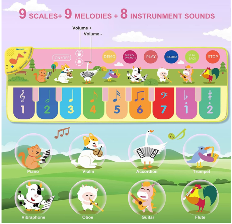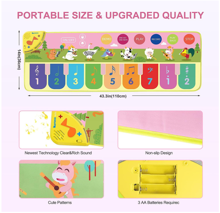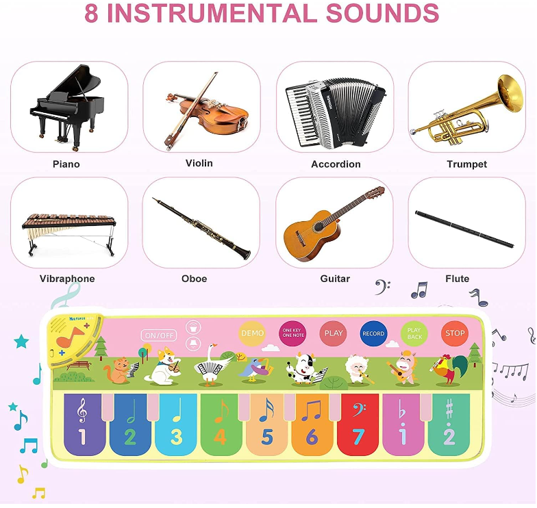 Covorașul pentru activități pentru bebeluși – Covorașul de joacă pentru bebeluși are 8 sunete unice de instrumente, inclusiv pian, vioară, acordeon, corn, xilofon, oboi, chitară, flaut și 9 taste negre cu tonurile muzicale corespunzătoare. Acest covor de joacă muzical vă va menține copilul în modul distracție ore întregi și, de asemenea, îl va ajuta să învețe cu cunoștințe muzicale.