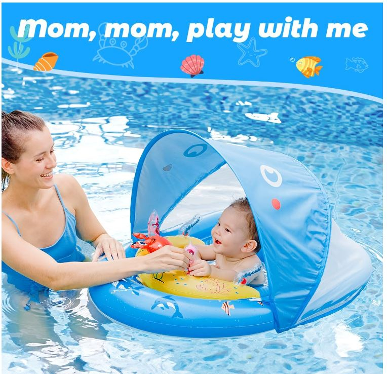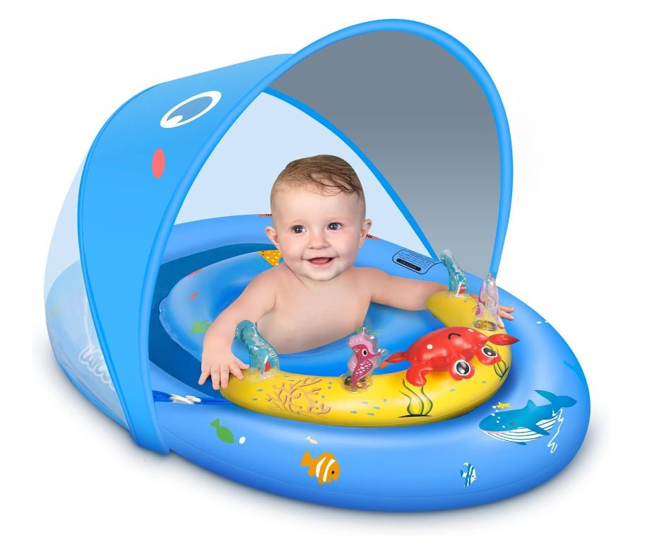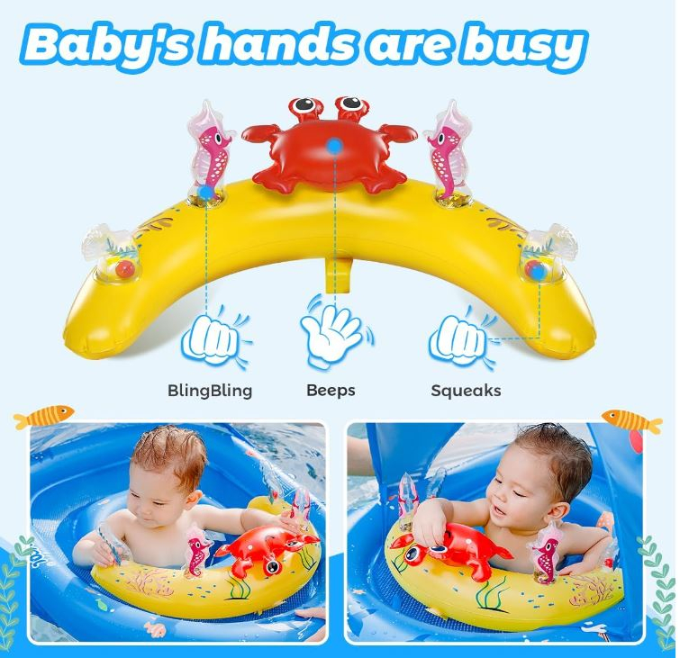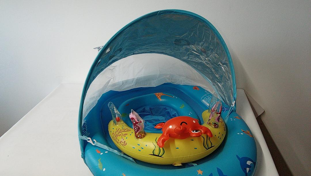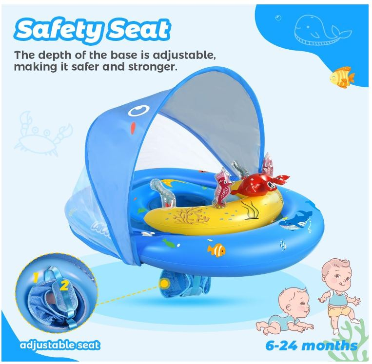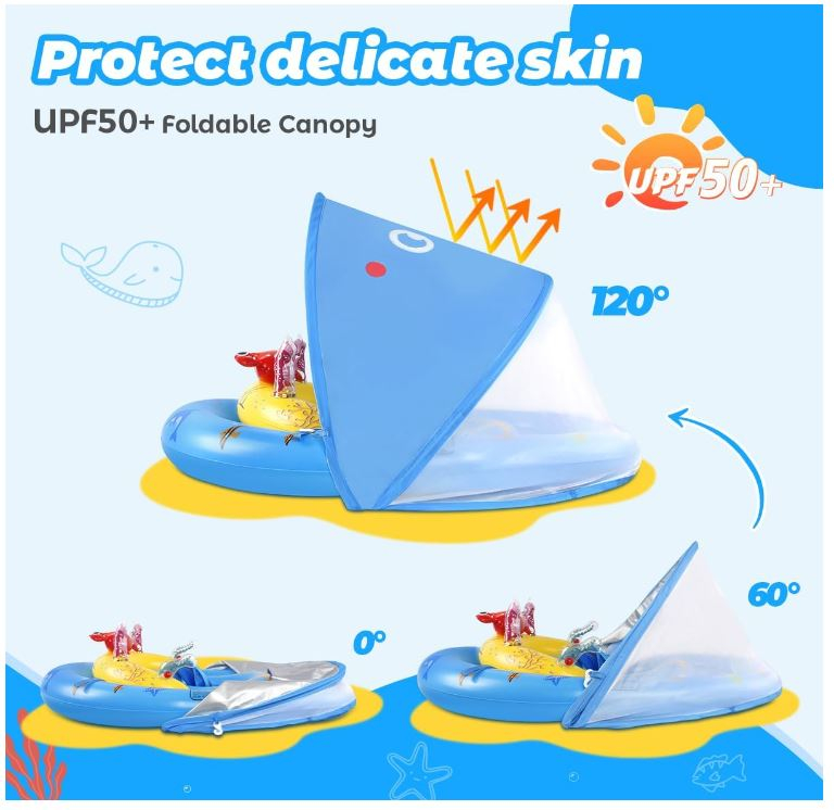 Protectie solara UPF 50+: Copertina detasabila/reglabila pentru o gama de 0-120 de grade, protejeaza pielea bebelusului in toate directiile. Portabil și pliabil, inelul de înot pentru bebeluși cu baldachin este ușor de depozitat și utilizat, făcându-l un articol grozav pentru călătoriile de vară în aer liber.