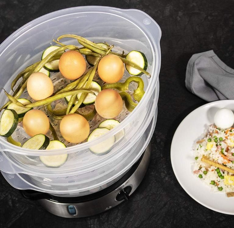 Posibilitatea de a găti până la 3 feluri de mâncare simultan datorită celor 3 recipiente ale sale, cu o capacitate totală de 9 litri. Include suporturi în grătare pentru a găti ouăle în cel mai omogen mod, iar părțile neelectrice se pot spăla în mașina de spălat vase.