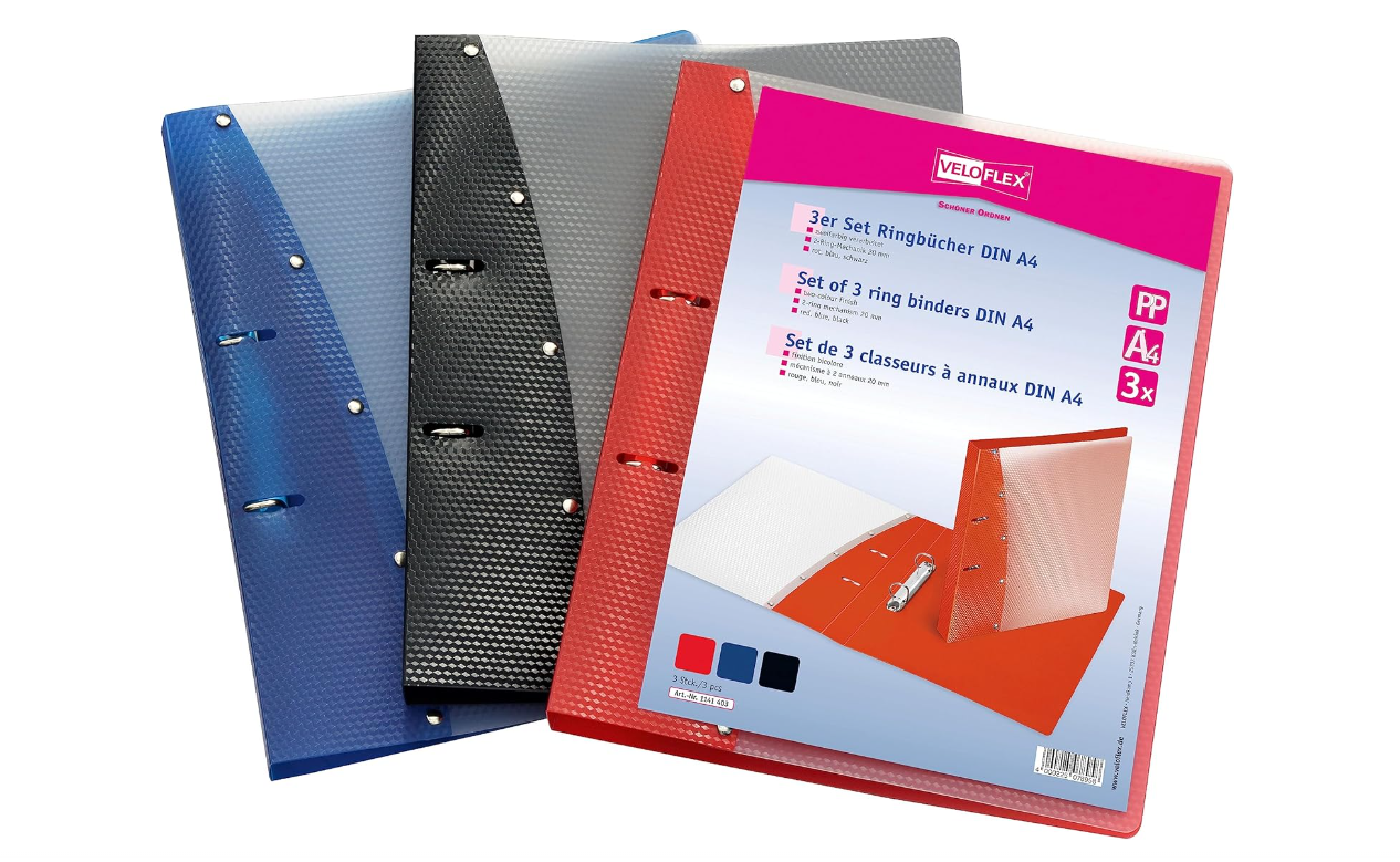Cele 3 mape sunt realizate din plastic solid din polipropilenă și sunt disponibile în albastru, roșu și negru