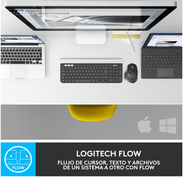 Control fără probleme a până la 3 computere cu un singur mouse și puteți chiar să copiați și să lipiți texte, imagini și fișiere între dispozitive.* * Este necesar software-ul Logitech Option, descărcat de pe site-ul nostru web.