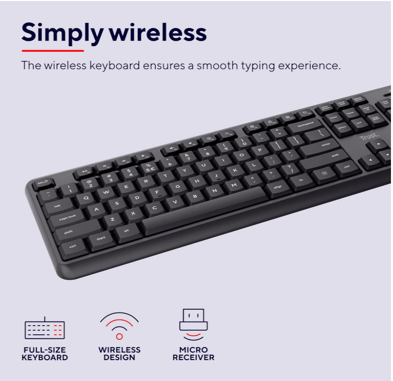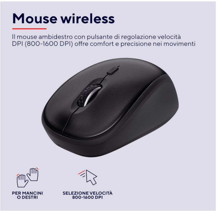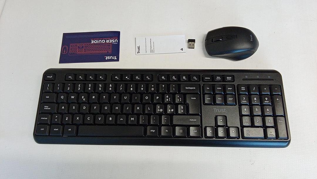 Setul Trust Ymo include o tastatură fără fir integrală cu aspect QWERTY în italiană și tastatură numerică și un mouse fără fir. Setul este compatibil cu Windows, macOS și Chrome OS