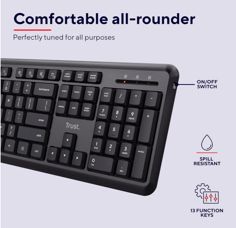 Hidratarea adecvată este esențială pentru a lucra. Tastatura Trust Ymo este rezistentă la lichide, așa că nu va trebui să vă faceți griji pentru câteva picături de pe tastatură. Fă-ți o ceașcă de cafea bună și continuă să lucrezi