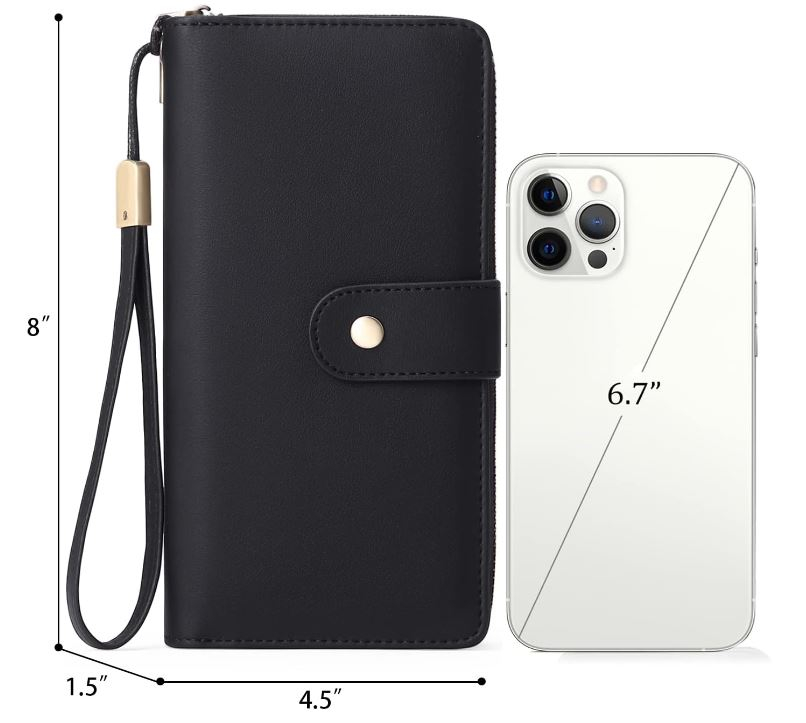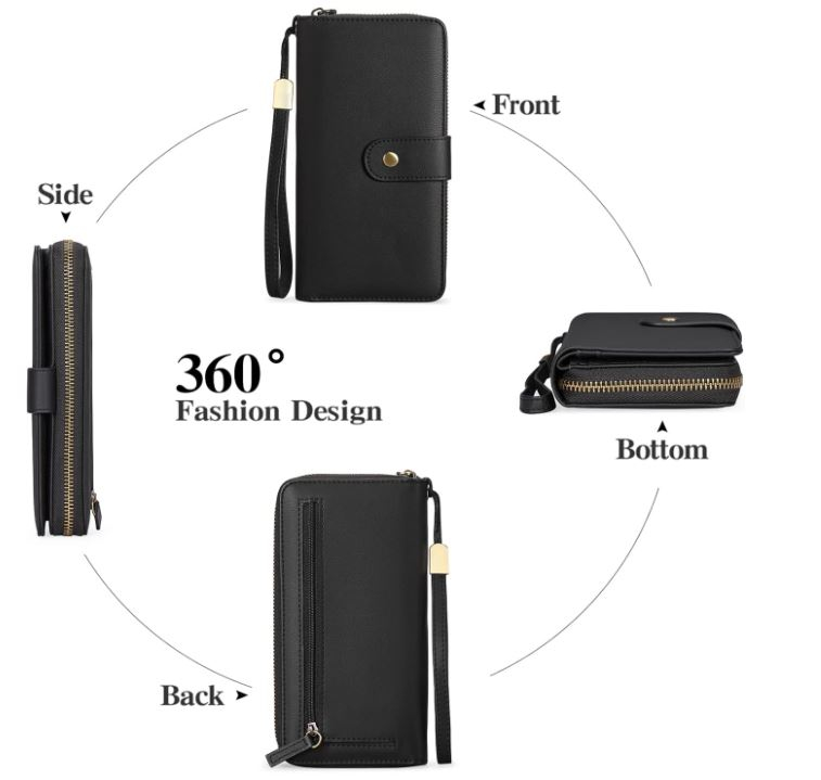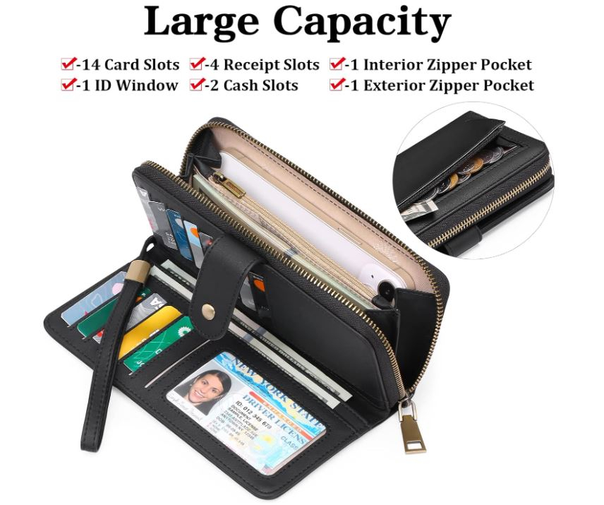 Portofel de mare capacitate pentru femei: 14 sloturi pentru carduri, 4 compartimente pentru bancnote, 2 buzunare pentru bani, 1 buzunar interior cu fermoar și 1 buzunar exterior cu fermoar, 1 buzunar pentru fereastra de identitate. Portofelul este potrivit pentru numerar, monede, majoritatea telefoanelor etc.