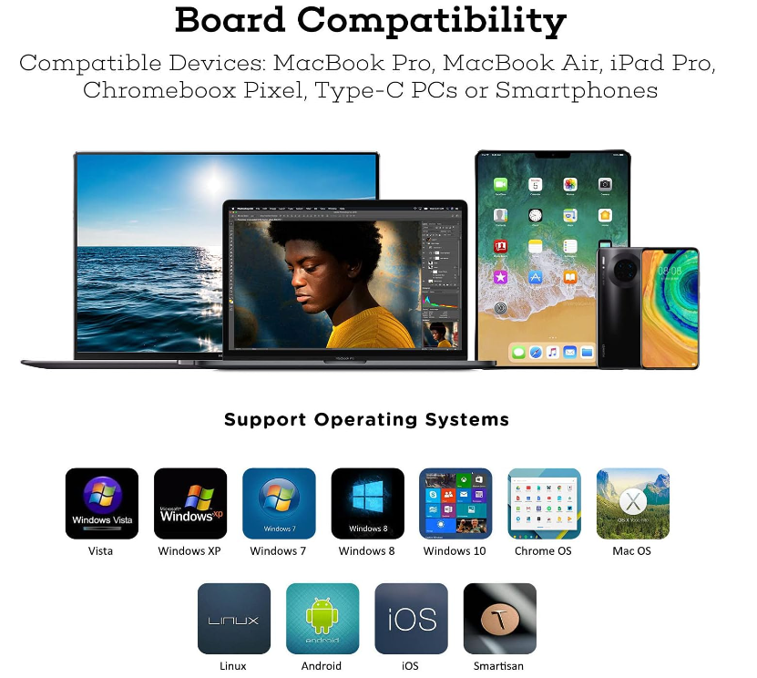 Macbook Pro USB C Hub este compatibil cu dispozitivele al căror port USB-C acceptă DisplayPort sau Thunderbolt 3, cum ar fi New Macbook, Macbook Pro 2017 2019 2020, Macbook Air 2020, Google ChromeBook Pixel, Huawei Matebook, Dell XPS etc. Compatibil cu Windows 2000/XP/Vista/7/8/10, MAC 9.1/10.2 și versiuni ulterioare