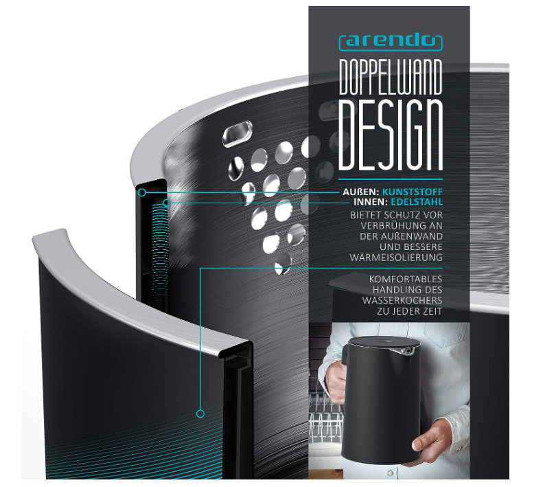 Caracteristici de confort: Ușor de umplut datorită indicatorului de nivel interior. Carcasă cu înveliș cu pereți dubli - numai cald la atingere când fierbe. Ușor de curățat camera de umplere datorită bazei plate. Buzzer-ul poate fi dezactivat (de exemplu, pentru a evita trezirea copilului). Testat de siguranță (GS): Produsul nostru a fost testat și certificat pe scară largă cu marca de siguranță GS recunoscută la nivel mondial.