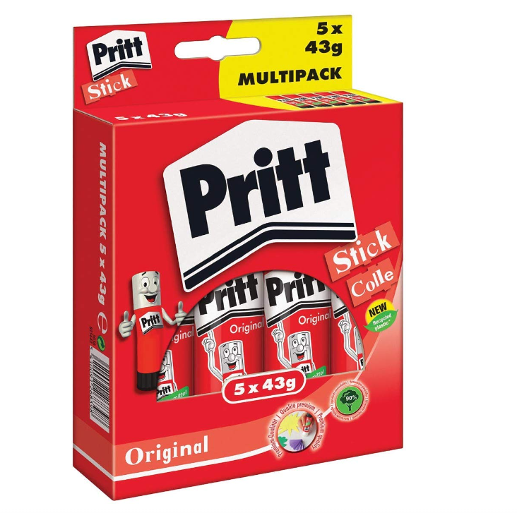 Pachet convenabil – Lipici Pritt Glue Stick fără solvenți pentru hârtie, carton, pâslă, fotografii și bumbac, 97% ingrediente naturale, inclusiv apă, transparente, 5 x 43 g.