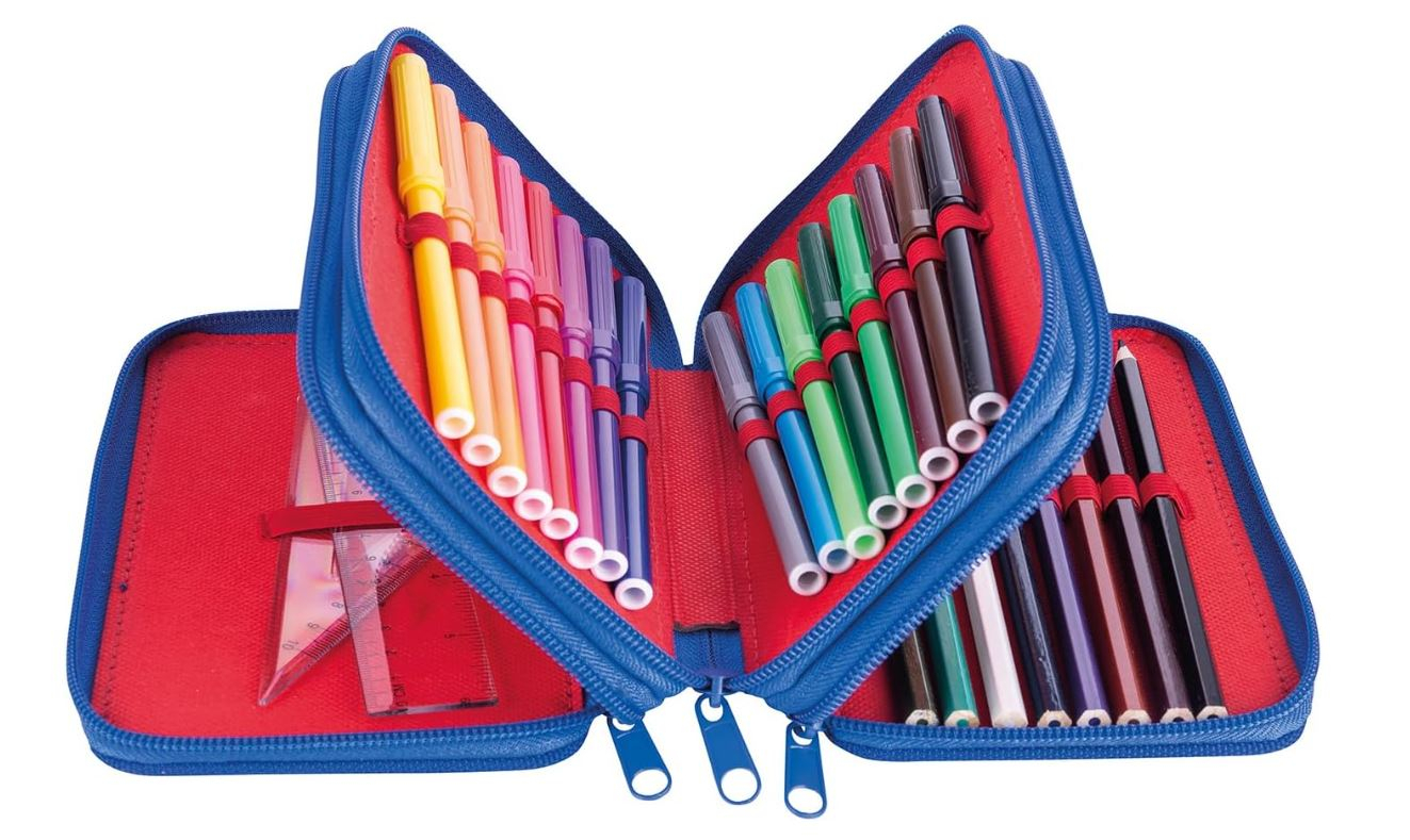 Setul include accesorii (riglă, echer, 3 pixuri, creion, radieră, ascuțitoare, 16 carioci, 16 creioane colorate)