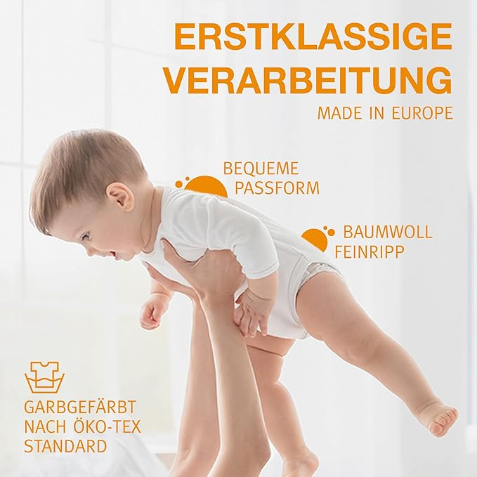 100% bumbac: body-urile noastre sunt fabricate din 100% bumbac super moale (țesătură fină cu 210 g/m²) și au trei capse fără nichel în zona inghinală pentru o deschidere și închidere rapidă. Prin urmare, sunt deosebit de prietenoase cu pielea și potrivite și pentru copiii predispuși la alergii.