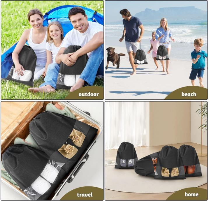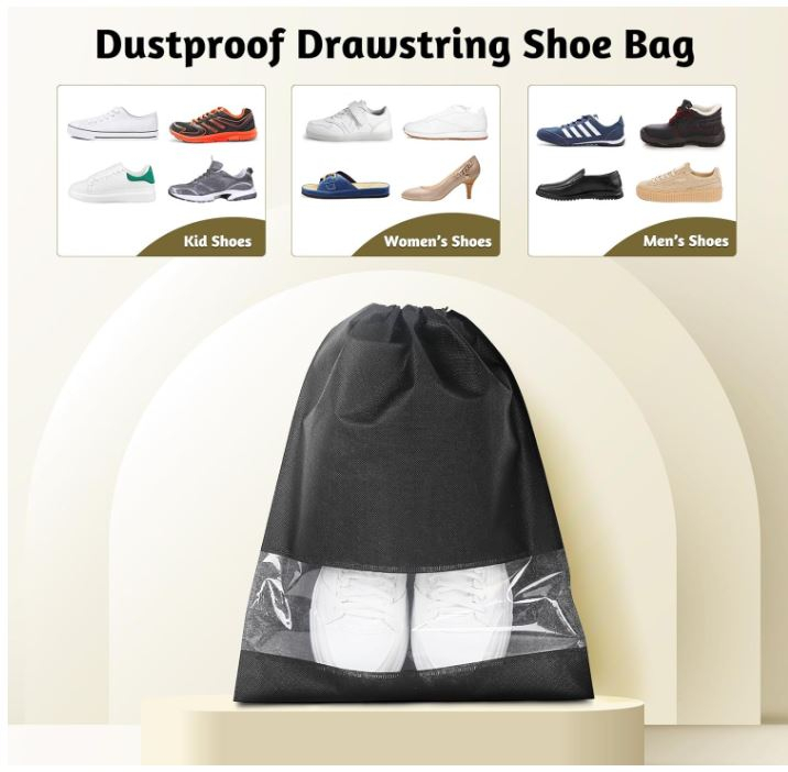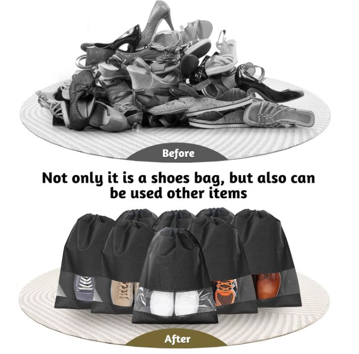 Design cu șnur: partea superioară a genții de pantofi este echipată cu un șnur, ușor de deschis și închis, care vă poate ajuta să vă păstrați articolele curate și ordonate, prevenind în același timp praful și uzura. Protejează pantofii de zgârieturi și murdărie atunci când îi pui în valiză, păstrându-i organizați și fără praf în interior.