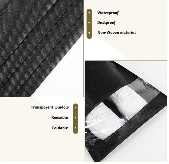 Geanta de pantofi este fabricată din material nețesut ecologic, rezistent la umiditate, impermeabil, rezistent la mucegai, inodor, respirabil, durabil, reutilizabil, pliabil, ușor, design simplu, fără model de imprimare pe exteriorul genții, poate fi folosit pentru a împacheta alte obiecte mici în afară de cabluri, pantofi, haine și produse cosmetice.